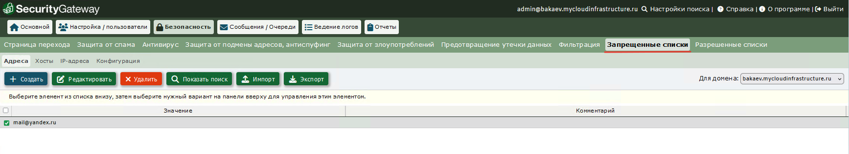 Чтобы добавить адрес в список заблокированных адресов, нажмите кнопку «Создать» на панели инструментов в верхней части страницы. Откроется страница «Запись в запрещенном списке» для добавления электронного адреса.