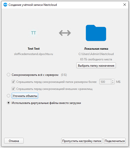 Можно выбрать синхронизировать все файлы с сервера Nextcloud или выбрать отдельные папки. Локальная папка для синхронизации по умолчанию — Nextcloud. Вы можете изменить её при необходимости.