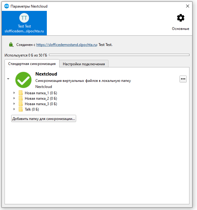 После того как выберите папки для синхронизации, нажмите кнопку «Подключить» в правом нижнем углу. Клиент попытается подключиться к серверу, и в случае успеха мастер настройки закроется.