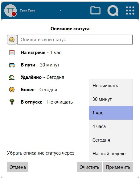Установите промежуток времени, после которого статус должен быть очищен. Нажмите на кнопку в правом нижнем углу и выберите нужное значение из выпадающего списка. Кликните «Очистить», чтобы удалить сообщение о статусе.