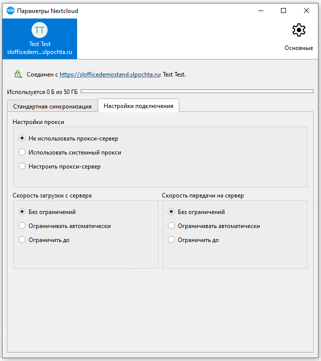 В верхней части окна находятся вкладки для каждой настроенной учетной записи (на картинке настроена только одна учётная запись, но существует возможность добавить дополнительные УЗ) и вкладка «Основные» для общих настроек. На вкладках учетной записи отображено: