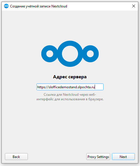 Введите URL-адрес сервера Nextcloud. Это тот же адрес, который вы вводите в браузере для доступа к Nextcloud. Предоставляется при выделении подписки.